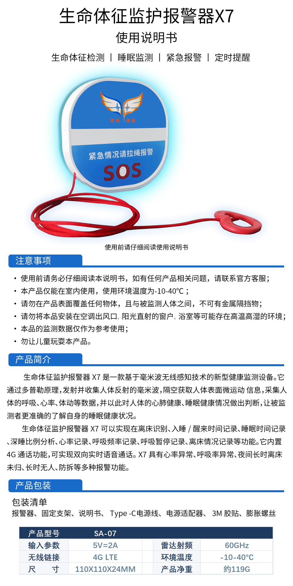 公司正式推出基于毫米波无线感知技术的旗舰产品——生命体征监护报警器X7。该设备利用多普勒原理,实现了非接触式的呼吸、心率及睡眠质量精准监测,彻底改变了传统穿戴式设备的束缚感。X7不仅具备离床识别、深睡分析等精细化功能,更内置4G双向通话与多重异常报警机制,为独居老人及术后康复人群构建了一道“无感却时刻在线”的安全防线。